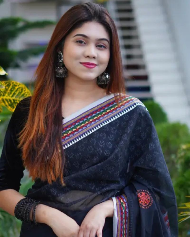 এই প্রিমিয়াম হাফসিল্ক বুটিক শাড়িটি পুরো শরীর জুড়ে মনোমুগ্ধকর ব্লক প্রিন্ট ও সূক্ষ্ম এমবোডারির নিপুণ কারুকাজে সমৃদ্ধ।